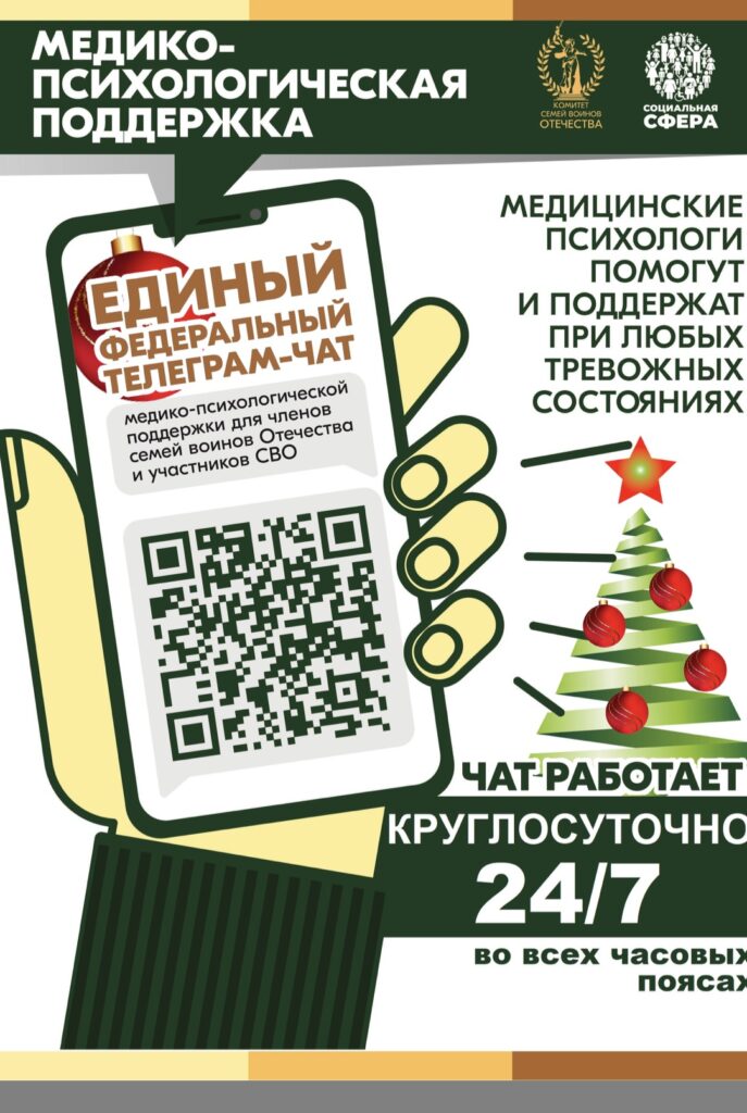 Продолжает работу единый федеральный чат Комитета семей воинов Отечества, предоставляющий бесплатную медико-психологическую поддержку семьям и участникам специальной военной операции. В чате круглосуточно (24/7) работают квалифицированные клинические психологи, оказывая помощь при тревожных состояниях, эмоциональном выгорании, стрессовых и кризисных ситуациях. Консультации доступны жителям всех регионов России и проводятся в анонимном формате, без необходимости раскрытия персональных данных. Проект реализуется Комитетом семей воинов Отечества совместно с Фондом «Социальная сфера» при поддержке Общественной палаты Российской Федерации.