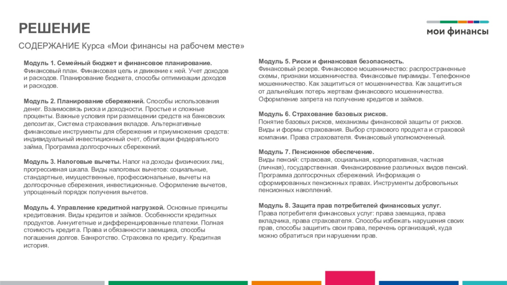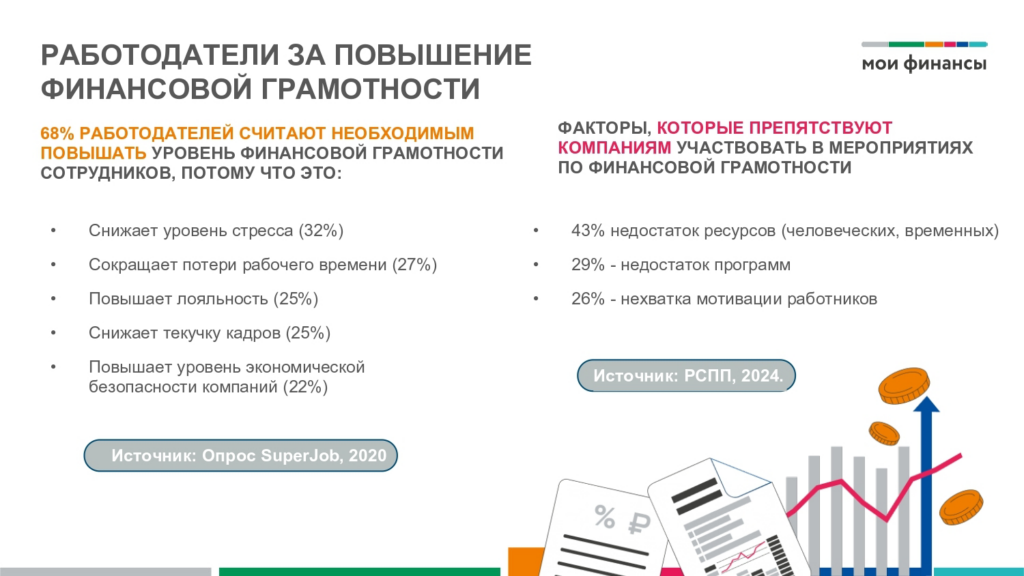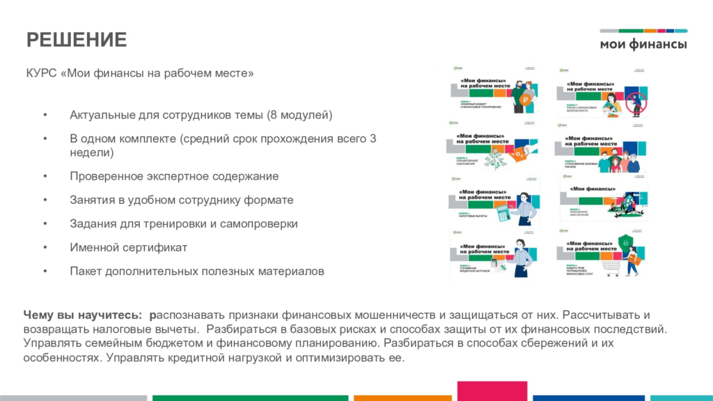 Сформирована комплексная программа по повышению финансовой грамотности и формированию финансовой культуры взрослого экономически активного населения «Повышение финансовой грамотности на рабочем месте» среди работодателей Российской Федерации. Программа включает в себя: онлайн-курс для сотрудников предприятий «Мои финансы на рабочем месте», включающий систему тестирований; личные кабинеты для специалистов кадровых служб, функционал которых позволяет отслеживать процесс обучения сотрудников; систему консультирования от экспертов для специалистов кадровых служб. Информация о Программе представлена на официальном сайте «Мои финансы»: https://xn--80apaohbc3aw9e.xn--p1ai/courses/fin-gramotnost-na-rabochihmestah/about/
