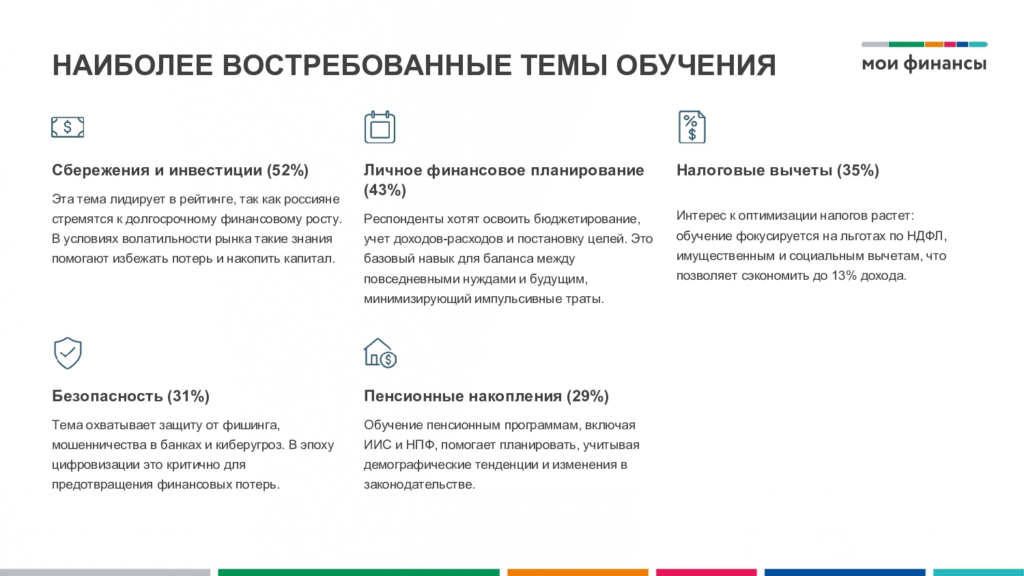 Участники курса узнают, как решать личные финансовые вопросы и потренируются применять полученные знания в конкретных жизненных ситуациях. Обучение построено на кейсах из реальной жизни: оно поможет не только узнать полезную информацию, но и сформировать полезные финансовые привычки.