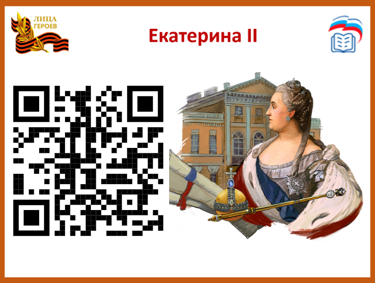 Екатерина II (1729 — 1796 гг.)— великая императрица. Время правления Екатерины II славится военными победами, которые способствовали расширению наших земель и укреплению авторитета России на мировой арене. Были присоединены Крым, Новороссия, часть Кавказа и важнейшие крепости Керченского пролива, упрочившие положение империи на Черном море. Она выступала за идеи мирового просвещения и активно развивала области образования, культуры и искусства.