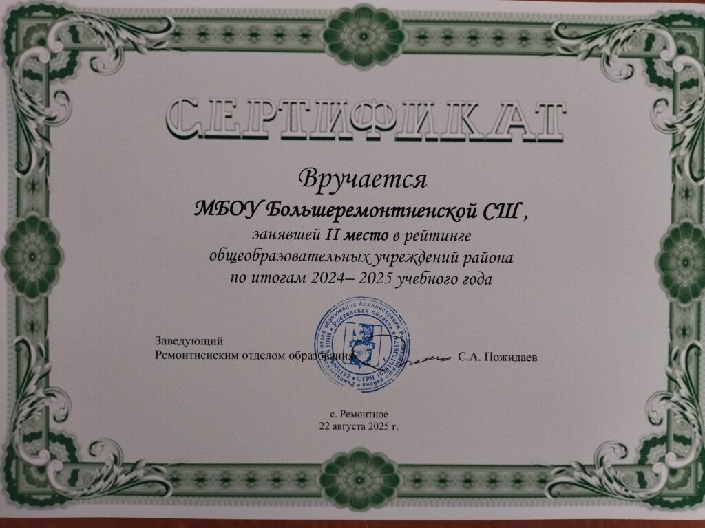 На Торжественной линейке, посвященной «Дню Знаний», директор школы Торбенко Галина Алексеевна подвела итоги 2024-2025 учебного года. В результате слаженной работы учащихся и коллектива школы мы заняли II место в районном рейтинге общеобразовательных учреждений по итогам прошлого учебного года! Поздравляем нас!