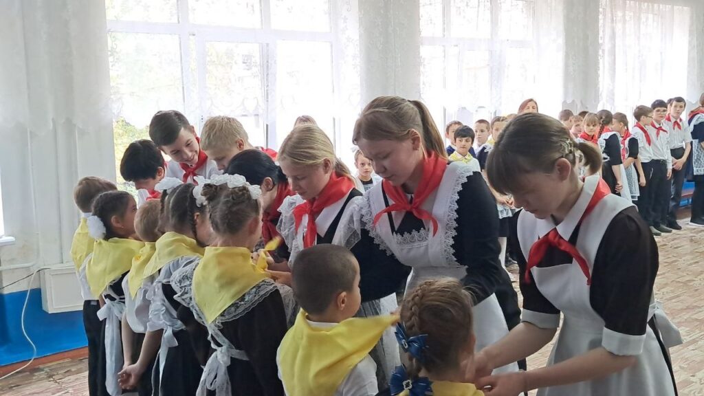 Отряд «КВН» (2 класс) рассказал о себе, произнес клятву ДОО «Росинка» и получил слова напутствия от старших ребят. Также коллектив 2 класса получил вымпел о вступлении в детскую организацию. Особым моментом было вручение желтых галстуков символа нашей организации.
